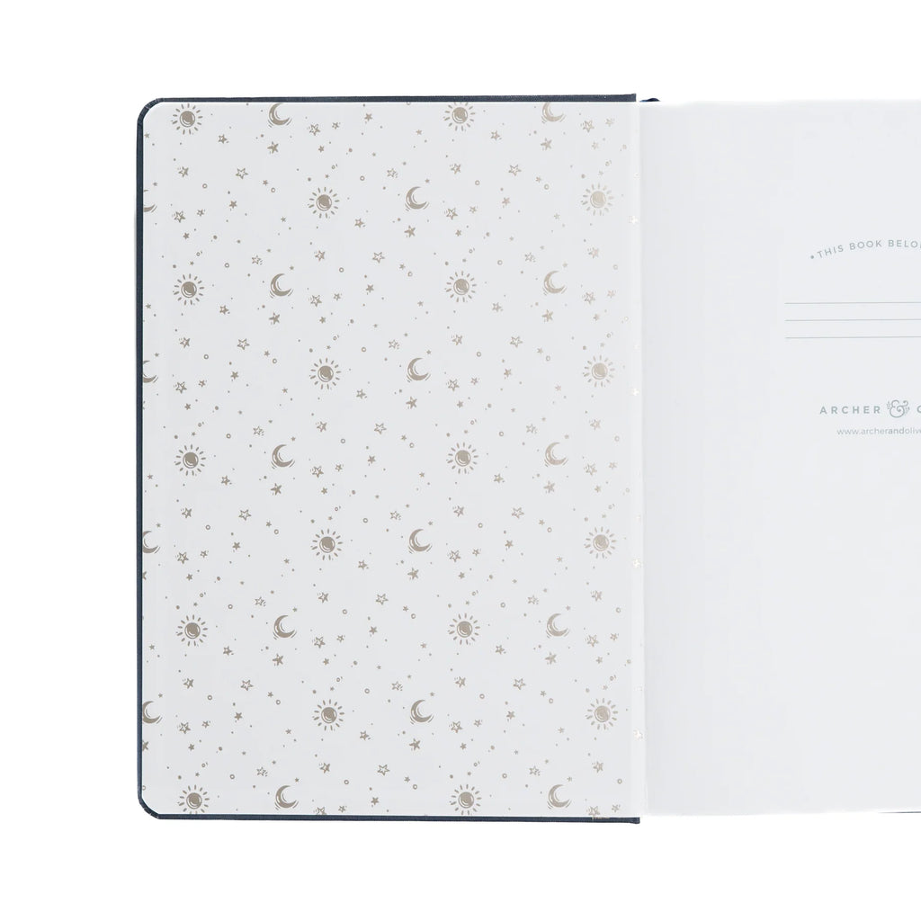 Leap into your imagination with the Forest Foxes A5 Dot Grid Notebook from Archer & Olive — where playful foxes dance under moonlight and stars. Featuring a deep navy buckram cloth cover stamped with radiant silver foil, this design captures a moment of wild wonder and celestial charm.